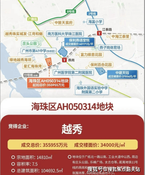 越秀·熙悦江湾由越秀地产独资打造,2026年9月19日,越秀地产以楼面价3.4万/㎡、总价35.6亿元,成功竞得海珠广纸314地块,精准占位广佛轴心核心辐射圈,地处海珠重点开发的广纸板块,承载着迭代海珠西人居品质、打造广府系标杆作品的使命。广纸板块自2015年启动开发以来,历经十余年沉淀,已形成连片成熟社区,商业、公园等配套逐步落地,城市面貌整洁有序,生活氛围浓厚。项目占地面积14810㎡,出让面积13959㎡,总建面约104693㎡,体量不大,属于小型精品社区,规划4栋57层高层住宅,总户数约1040户,背靠越秀·星汇海珠湾56万方成熟大盘,可直接共享大盘优质配套。交通方面占据双地铁优势,直线距离“换乘之王”广佛线燕岗站约400m,距离已开通的广州首条黄金环城线11号线棣园站约250m,11号线采用内外环运行,单程约75分钟,7站可达广州南站、7站直达琶洲,轻松串联天河、越秀、荔湾、海珠四大核心区域,虹吸广佛优质资源,30分钟内可辐射广佛核心商圈,加之工业大道等主干道环绕,无论是日常通勤还是商务出行,都高效便捷,成为2026年海珠西降价后最具性价比的刚改优选楼盘。