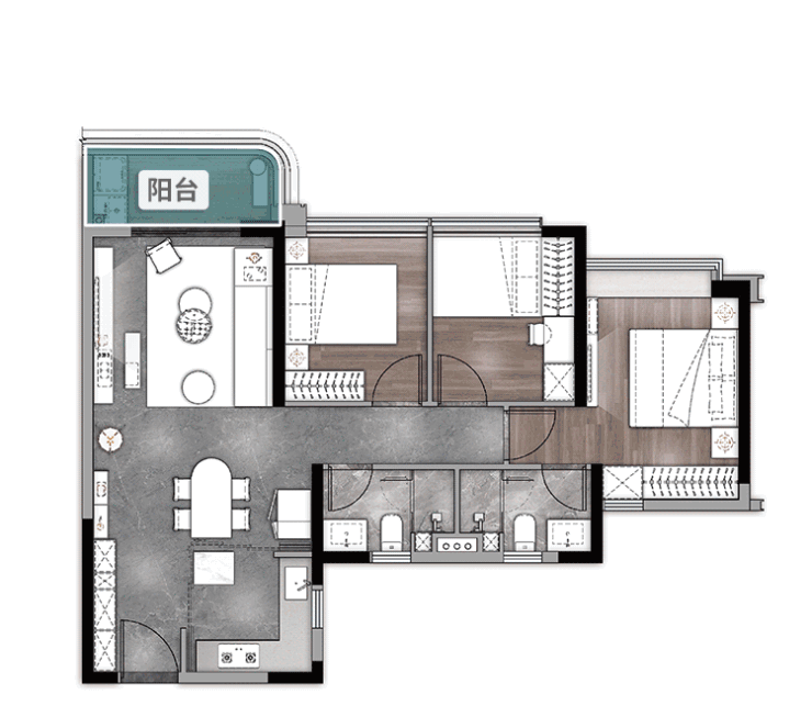 建面约89~126㎡三房至四房,注入客餐厨一体化、超大面宽阳台、与270°主卧落地窗等前卫设计,功能强大。