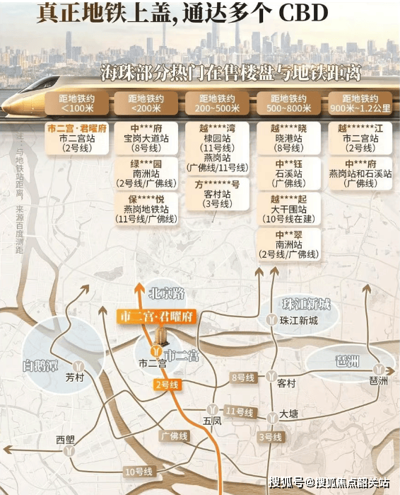 交通便利:『君曜府』紧邻地铁2号线市二宫站B出口,直线距离仅约80米。无论是前往珠江新城还是琶洲CBD,都能轻松快捷地到达。