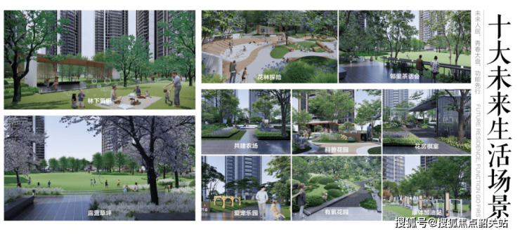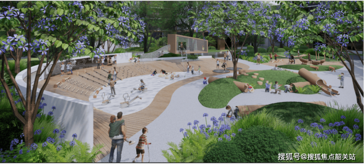 首期住宅小区采用大围合布局,以“活力剧场,都市森林”为理念,打造“三轴两带”“双环十景”约4.4万㎡景观园林,包括约4000㎡无界草坪剧场、山丘越野·儿童成长乐园、爱宠乐园等。