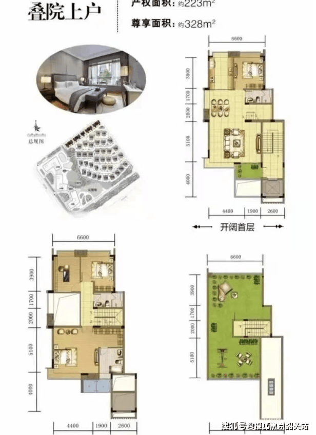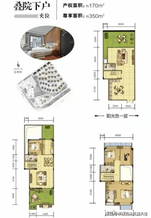 叠墅:房产证面积在170㎡至223㎡之间,使用面积可达325㎡至350㎡不等,售价约在1050万至1175万之间。