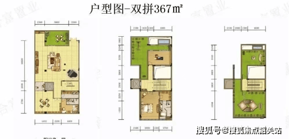 双拼:房产证面积从313㎡到367㎡不等,使用面积可高达850㎡至1000㎡,总价范围在2100万至2280万元之间。