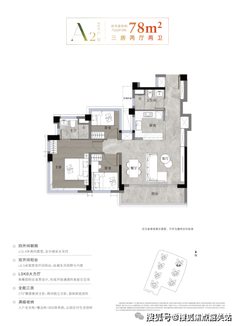 78㎡三房两厅两卫:单价 4.0-4.35 万 /㎡,总价 310-340 万,广州主城稀缺小面积三房,全南向,双卫设计,得房率约 110%,同等建面多享约 8㎡空间,刚需首选