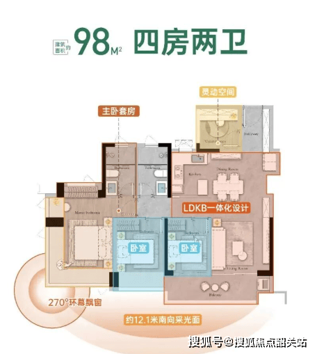 约98㎡四房两卫:空间灵动,满足二胎家庭成长需求;