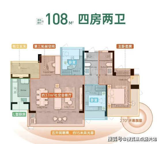 约108㎡四房两卫:阔绰尺度,兼顾三代同堂与私密性。