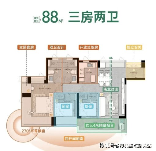 约88㎡三房两卫:紧凑高效,适合首置刚需;
