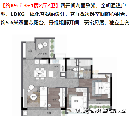 四开间采光,全明通透,LDKG 一体化客餐厨灵动设计,客厅与次卧空间可随心组合,约 5.5 米双面宽阳台,景观视野开阔,配备独立主套,开间达 3.8M,尽显豪宅配置。