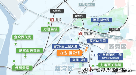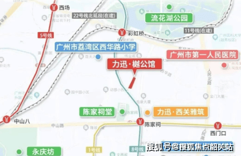 项目距离地铁8号线与11号线交汇的彩虹桥站约500米,步行6分钟左右;往东600米则是1/8号线的陈家祠站。两条地铁线覆盖了广州主城多个核心区域,比如从彩虹桥出发,换乘一次就能到珠江新城或琶洲。对于日常通勤或周末出行的人来说,这种“双地铁夹心”位置,在老城区里并不多见。