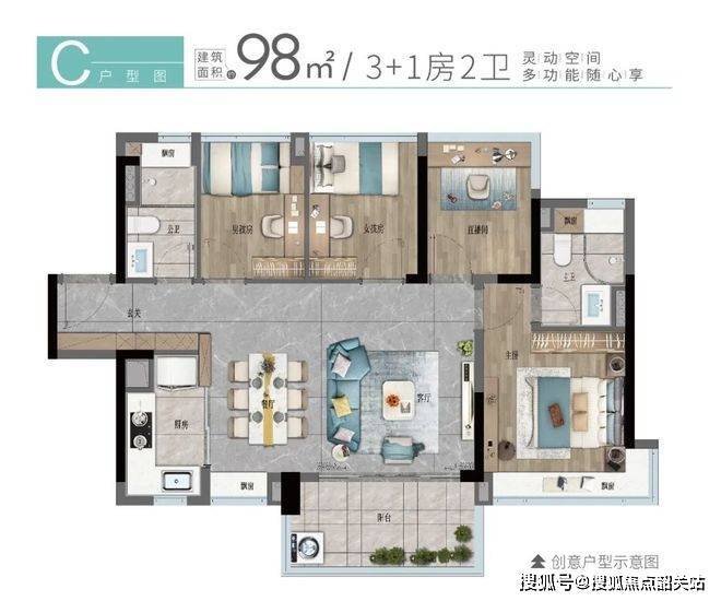 只要稍稍改造,阳台处即可变身为功能房,轻松获得4房享受。