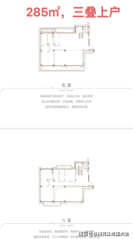三叠户型:上叠面积285㎡,中叠面积279㎡,下叠面积305㎡,每户最高可做到6房设计,实用率高。
