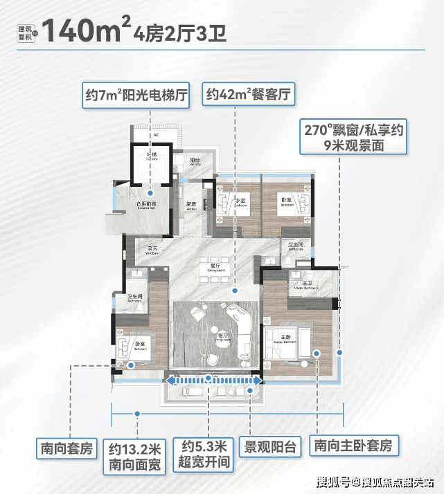 答:这一数据主要得益于最新的建筑规范政策。项目利用新规中关于飘窗、阳台及设备平台的计算规则,通过加大飘窗进深、设置半封闭阳台等方式,将原本不计入或半计入产权面积的空间转化为实际可使用面积。例如,270度的转角飘窗和15米长的转角阳台,都极大地扩展了室内的实际使用空间,使得套内实用面积接近甚至超过建筑面积。