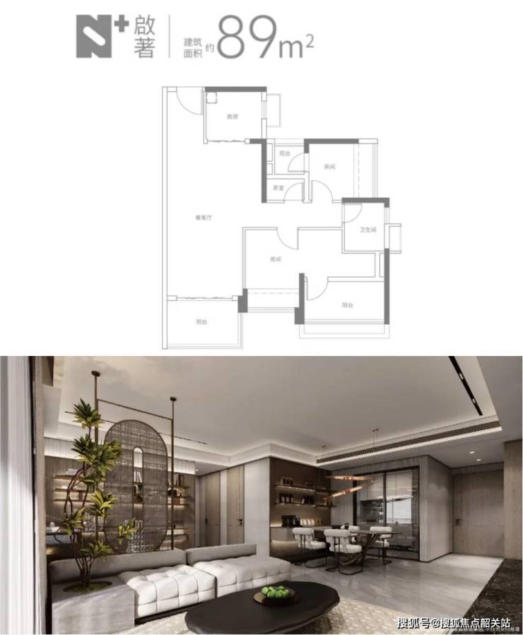 89㎡三房:LDK一体化设计,主卧带270°转角窗,得房率91%;