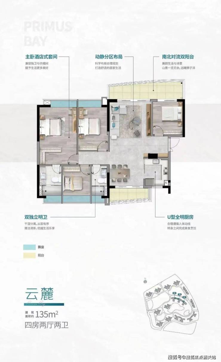 132㎡四房两厅两卫:一体式双厅布局,双阳台设计,房间设阔景飘窗。