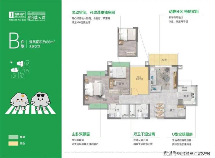 86㎡3房2厅2卫:U型全明厨房设计,主卧双飘窗,仅提供40席。
