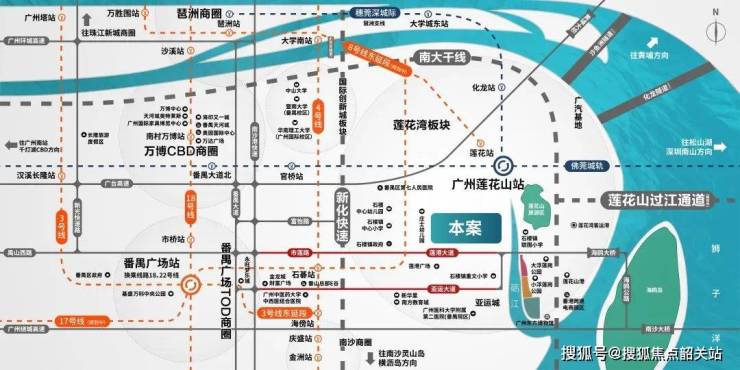 轨道交通:距离项目10分钟车程可达莲花山站,通过8号线东延段(规划)、17号线(规划)、佛莞城轨(预计2022年年底通车)等线路,便捷通达琶洲、万博、广州南站等地。