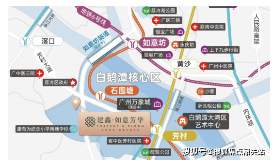 4、 **交通与地段优势**:建鑫如意芳华地段优越,邻近如意坊隧道,未来可自如往返新老荔湾两岸。左手千年西关,拥有荔枝湾、沙面岛、永庆坊等丰富的历史人文资源,2000年人文底蕴浸润日常;右手千亿鹅潭,占位总固投约3700亿白鹅潭世界级商圈,享受3KM核芯资源圈。交通方面,约700米直通如意坊隧道(一期预计2025年开通),可往返珠江两岸接驳内环路、畅达全城;约1KM到珠江大桥、2KM到珠江隧道、3KM到洲头咀隧道,畅达主城四区。约600米到11号线石围塘站,11号线作为广州首条环线地铁换乘王,1站如意坊换乘6号线,1站芳村换乘1号线/22号线(建设中),2站中山八换乘5号线直通珠江新城,无论是自驾还是公共交通,出行都较为便捷。