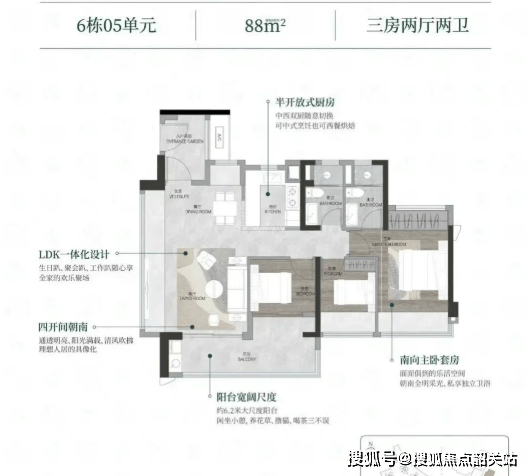 7、 **户型与园林设计**:项目以新规超100%使用率户型设计带来良好的人居体验,适配多场景家庭形态。户型全南向布局,阳台尺寸较大,88平户型阳台开间约6.2米,105平户型约6.5米,125平户型达到8.3米。所有户型均有入户花园,各个卧室也都有超大飘窗,注重采光和空间利用率。整个社区采用围合式布局,中间有大片园林,体量适中,保障了居住舒适度,为居民营造了温馨舒适的居住空间。
