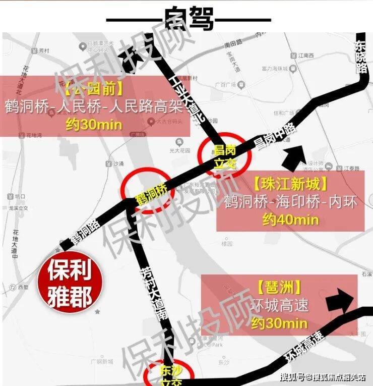 驾车出门就是鹤洞路,往东经过鹤洞大桥,10分钟就到海珠西,转芳村大道可以接驳珠江隧道去老西关,洲头咀隧道和东沙隧道可以去海珠西,环城可以去到中心各区,往西经芳村大道南去佛山。