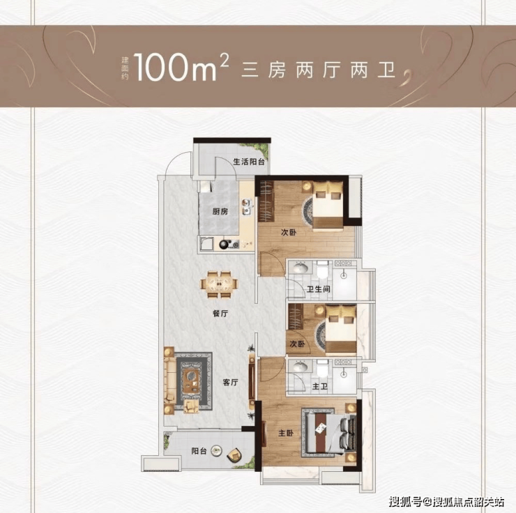 产品方面,100㎡三房客餐厅空间充裕,厨房连接生活阳台较为实用。卧室集中分布在客餐厅后面的设计,虽然增强了三间卧室的私密性,但也造成了通道空间的浪费,中间次卧面积较小。