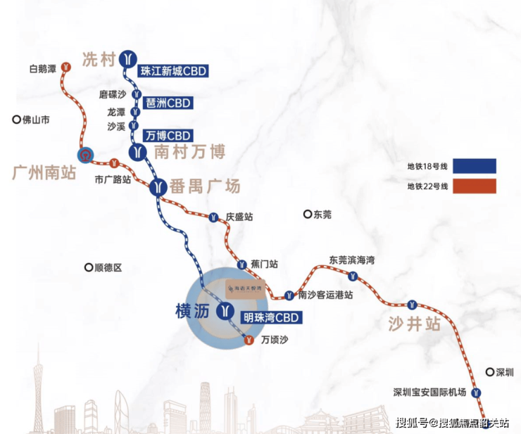 18号线串联珠江新城、琶洲新区、番禺万博、国际金融岛四大城市CBD,南延线通达中山、珠海。1站可换乘22号线,可通达东莞、深圳。