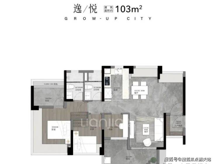 建面103平四房两卫:LDBK一体化设计,书房并入客厅,次卧床不靠窗的设计提升了居住舒适度。另一间北向次卧可用作二套房使用,主卧配备约280度飘窗,实现南北对流。