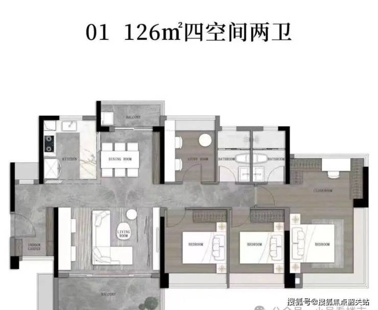 建面126平四房两卫:阳台可打通,四个卧室各具特色,主卧南北对流,配备270度飘窗,实现三面采光,其余三个次卧同样宽敞明亮。