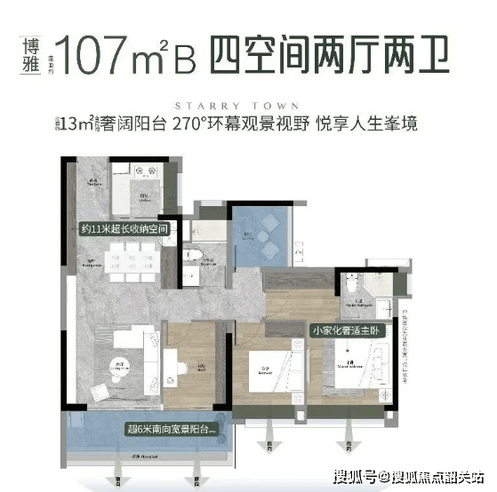所有户型均实现户户朝南,4至4.5开间南向采光,搭配270°宽景大阳台,最大化引入自然光线与景观视野。以88㎡三房为例,罕见实现三卧室全部朝南,超11米景观面让阳光洒满每个角落;107㎡四房户型则通过南向观景玄关、双面宽阳台、交互式方厅等设计,营造仪式感与功能性的完美平衡;125㎡五房更以餐客一体化大方厅、南北对流格局,满足多代同堂或二胎家庭的多元生活场景。