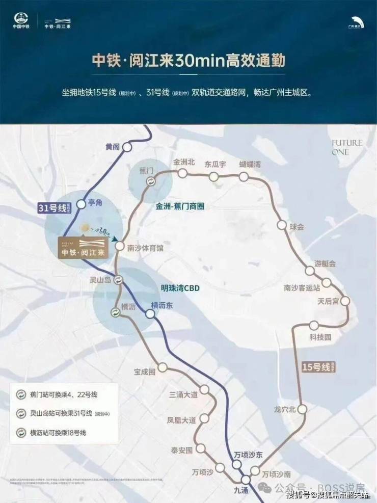 交通出行的便利性,是现代人生活中不可或缺的一部分。中铁阅江来在交通方面展现出了极高的优势。项目靠近万洲大桥、进港大道以及广澳高速,自驾前往广州市区、中山、珠海等地都非常便捷。虽然目前距离已开通的地铁站黄阁站和蕉门站有几公里之遥,但公交接驳仅需四到五站即可到达,出行依然十分方便。更为重要的是,附近有规划的广州地铁十五号线站点,这条线路一旦落地,将极大提升区域的交通便利性。届时,通过地铁十五号线、十八号线、二十二号线以及NS1线,居民可以在三十分钟内通达广州东站,实现快速通勤。此外,项目距离庆盛高铁站也不远,乘坐高铁可以快速前往东莞、深圳、中山,甚至半小时即可抵达香港西九龙,极大地拓展了居民的出行半径。高速路网方面,亭角大桥、广澳高速、南沙港高速等构成了四通八达的交通网络,四十分钟可达广州市区,一小时可达深圳、佛山、珠海等珠三角主要城市,真正实现了“半小时生活圈”的愿景。