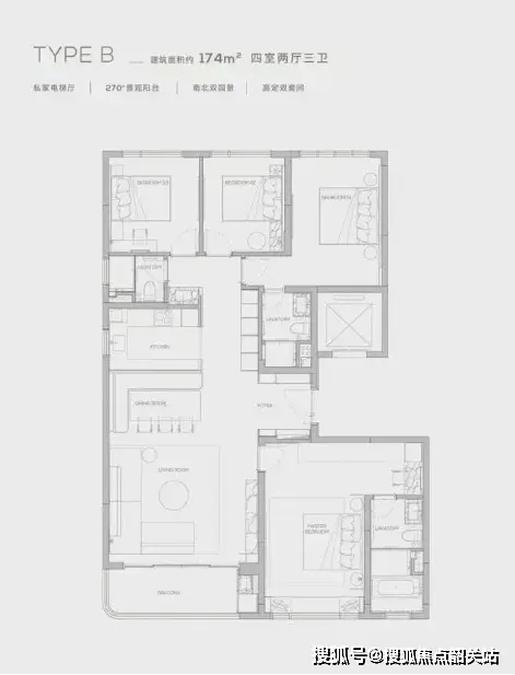 端户边厅设计带来270°环幕观景视野,主次双套房配置满足多代同堂或家政服务需求。动静分区明确,私密性更强,是中产家庭进阶改善的优选。