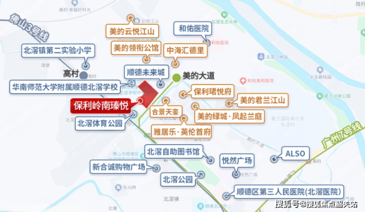 保利岭南瑧悦以“悦于形、悦于心”为生活主张,构建出“学铁商”三重核心环伺的全维生活圈。项目距离广州地铁7号线美的大道站约300米、佛山3号线高村站,形成双地铁上盖格局,快速通达广州南站,实现广佛高效通勤;一路之隔即华南师范大学附属北滘学校,形成真正目送式教育;北侧中海汇德里商业体盒马超市即将开业,下楼即可享受高端生鲜与日常消费。生态资源方面,北滘体育儿童公园、君兰河岸公园环绕,推门即入绿意,日常散步、亲子活动触手可及。社区内部三进式岭南园林融入九种非遗元素,亭台曲廊、游泳池、儿童活动场、托儿所、社区卫生站一应俱全,打造全龄友好、悦居乐活的东方社区。停车场司机休息区、储藏柜、洗车功能进一步提升归家便利性。周边和祐国际医院、新合诚购物广场已投入使用,医疗与商业配套完善。在北滘新城“一河四城”升级、千亿大镇人才流入的背景下,保利岭南瑧悦让每一天都成为岭南文化浸润与现代便利交融的诗意日常。