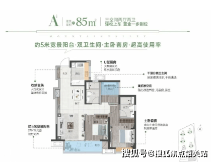 85㎡三房:南向 3 房带主套设计,约 5 米宽大阳台,视野开阔,超高赠送,户型使用率约 90%。U 型大厨房设计,洗、切、煮、炒操作流畅,主卧落地凸窗增加空间与采光,生活更随心舒适。