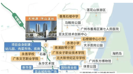 项目背靠尖峰山,远眺莲花山,自然资源丰富,未来还规划有千亩城市森林公园,为居民营造绿色生态的生活环境。医疗配套方面,约 3.2km 处有广州医科大学附属第二医院(番禺院区)(三甲医院),约 3.8km 处是广州中医药大学中西结合医院(三甲医院)(规划),为居民的健康提供有力保障。
