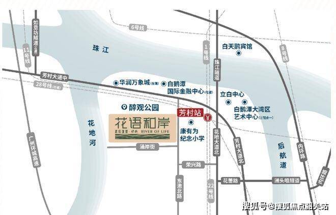 交通出行极为便捷,步行约 800 米可达 1 号线芳村站,这里是四线合一超级枢纽(1 号线已开通,11 号线、22 号线建设中,28 号线规划中),未来可 0 换乘直达广州站、广州南站、白云机场等重要交通枢纽,轻松畅连全城,满足商务出行、旅游等多种需求。周边花地大道及芳村大道交汇,3 公里内珠江隧道、洲头咀隧道、如意坊隧道(建设中)、东沙隧道(建设中)等 4 条隧道,接驳内环及环城,构建真正的环城轨道交通体系,占据珠江商圈半小时交通黄金席位。约 1 公里可达芳村码头,乘坐 S2 线到中大、广州塔,S6 线到海珠区永兴街、老荔湾黄沙,畅游休闲滨水生活,为居民提供多样化的出行方式,尽享便捷都市生活