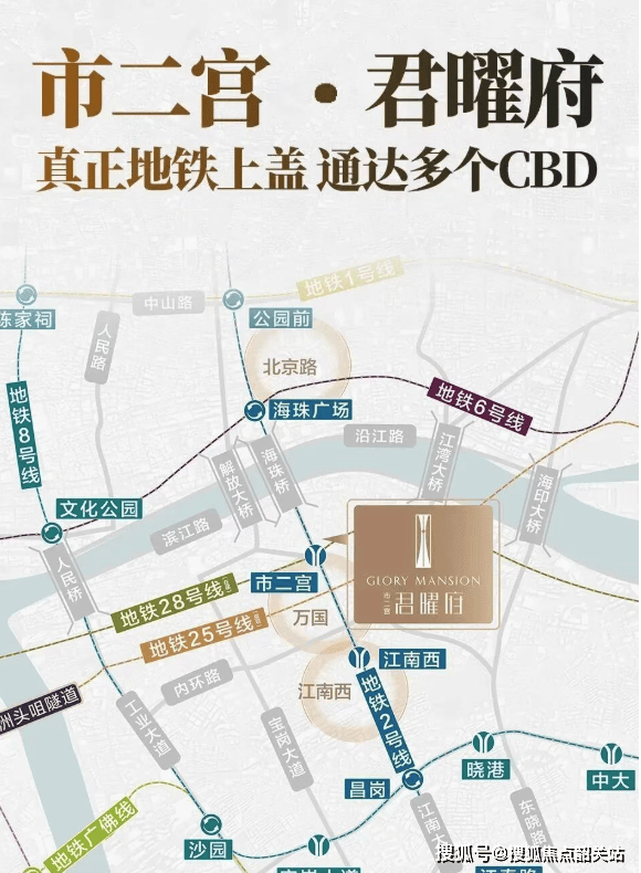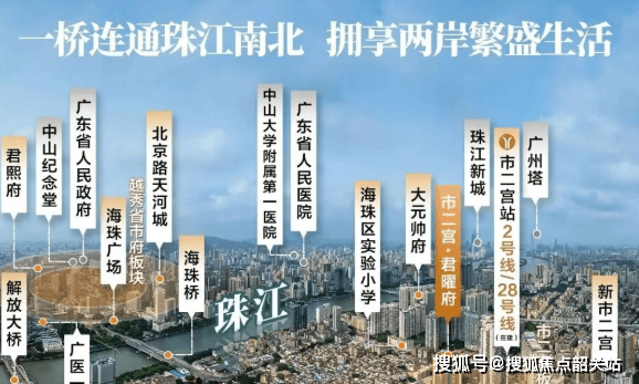 交通是君曜府最突出的优势之一。项目直接位于地铁2号线与在建28号线(佛穗莞城际)交汇的市二宫站上盖,真正实现“出家门即入地铁口”。2号线贯穿北京路、江南西、琶洲、珠江新城等核心商圈;而未来28号线作为时速160公里的市域高速轨道,将实现3站直达琶洲,并快速连接佛山、东莞中心城区,极大拓展通勤半径。地面交通同样便捷:江南大道、内环路、滨江路环绕周边,家门口市二宫公交站汇聚超20条日夜班线路。自驾经海珠桥或解放桥,10分钟内即可抵达越秀老城区,串联起省政府、中山纪念堂、北京路等城市地标。
