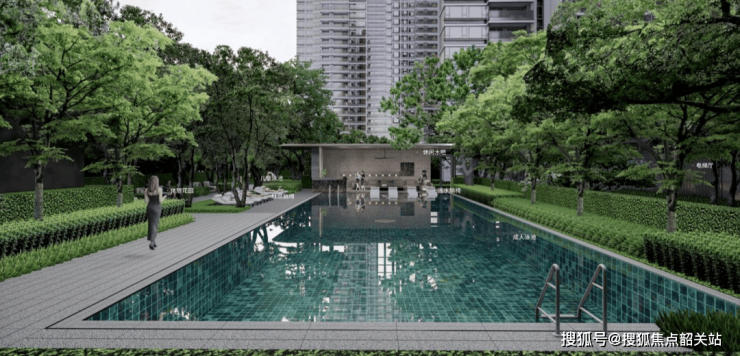 全龄泳池整体呈抬高式设计,以休闲水吧廊架串联成人泳池区域及儿童泳池空间,休闲水吧廊架可供休闲品酒会客,休憩等候,营造休闲度假氛围感。泳池周边阵列麻楝形成一个林荫环绕的泳池氛围,林荫下设置林荫休闲花园,提升泳池的私享品质度。