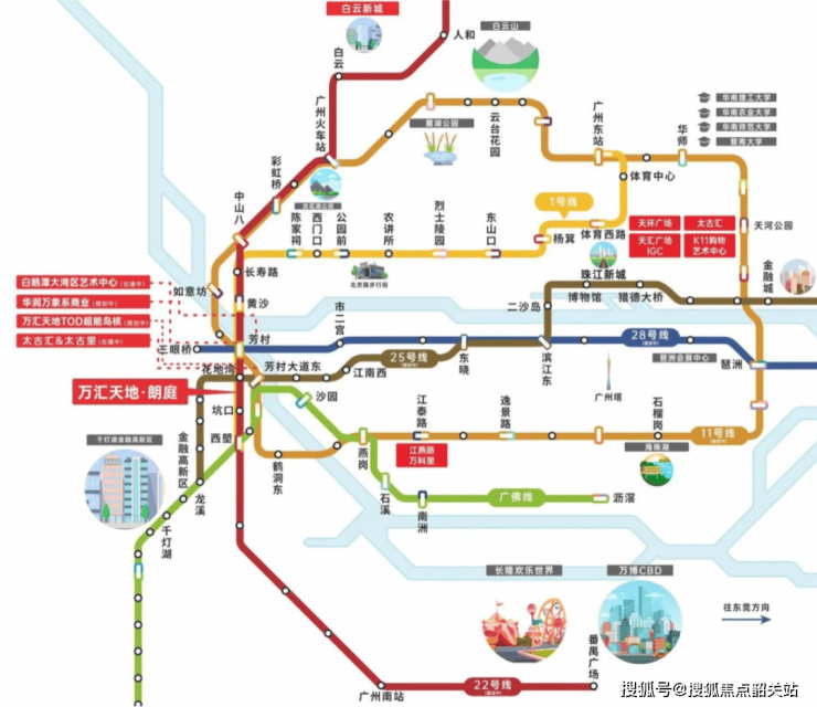 高线公园与天空花麓系统:将“高线公园”引入广州,进化全新的天空花麓系统,缝合了商业、写字楼等复合业态以及地铁花地湾站的空间,打造以地铁1号线(已开通)、25号线(规划中)为基础的双核TOD。