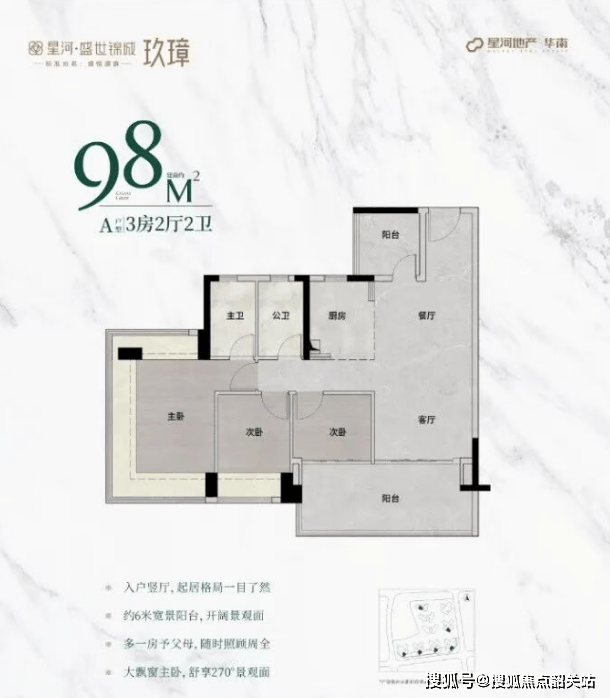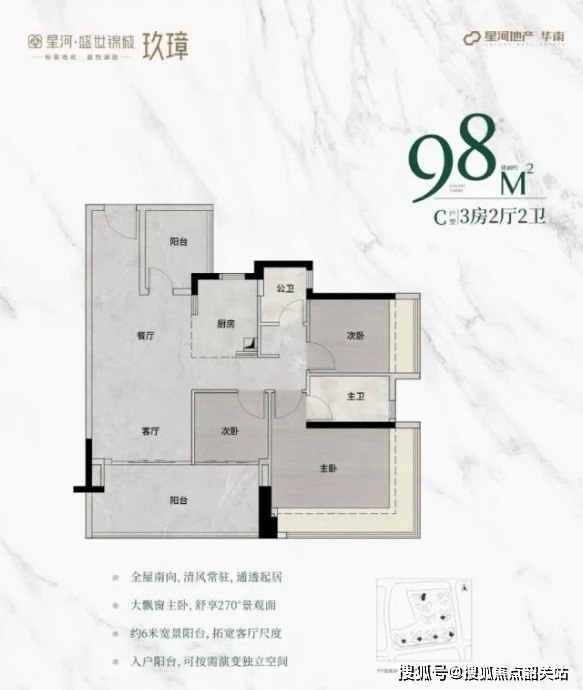 98㎡户型:主朝向朝南,配备270°无柱飘窗,视野开阔,次卧和阳台尺度大幅增加。