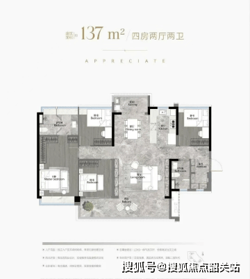 建面约137㎡ 四房两卫:带入户花园,大客厅+LDKB设计,主卧套房可实现对流;