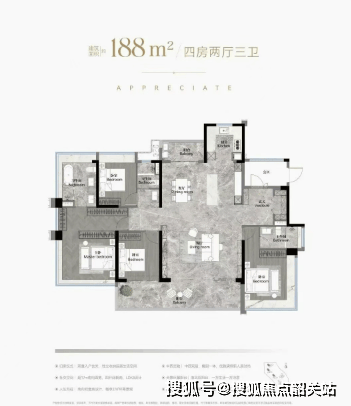 建面约188㎡ 四房三卫:终极改善之选,双主套分居两侧,9米跑道阳台,34㎡主卧带270°环幕飘窗,中西双厨+南北双阳台,居住体验媲美豪宅。