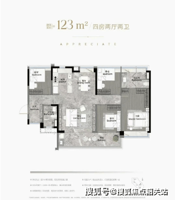 建面约123㎡ 四房两卫:南北对流,7米景观阳台,主卧配L型衣帽间,三间次卧尺度均衡;