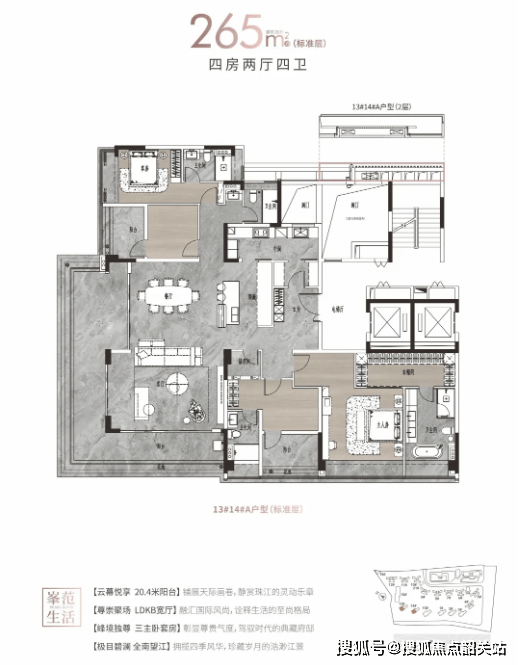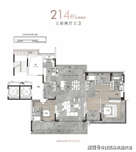 214-313㎡大平层:作为项目高端旗舰产品,大平层采用南北纯板楼设计,仅规划8层,全盘仅96套,稀缺性极高。户型主打“一楼赠花园、顶楼享天台”的专属权益,搭配专梯入户设计,保障业主私密性与尊贵感。室内空间尺度恢弘,采用大面宽、短进深设计,最大化吸纳江景与采光,部分户型可享800米巨幕江面景观,无任何遮挡。大平层配备豪华主卧套间、多独立卫生间、专属书房、影音室等功能空间,满足高净值家庭的品质居住需求,打造纯粹的高端江居圈层。
