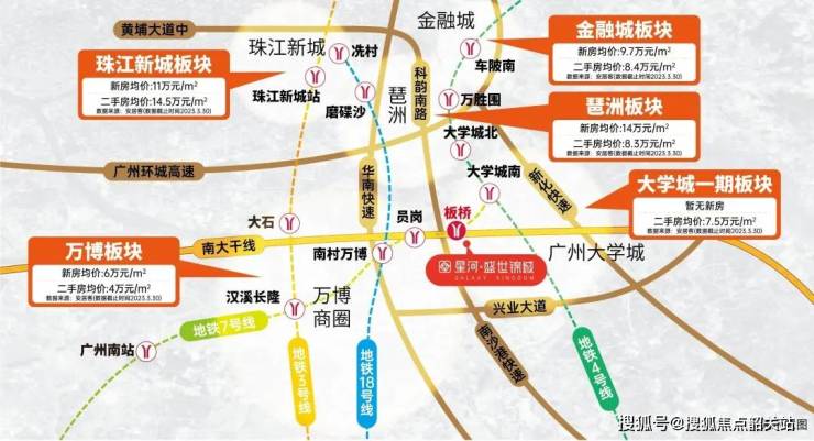 据高德地图2025年8月最新测绘,星河盛世锦城距地铁7号线板桥站仅300米,2站接驳万博CBD(万达广场),5站直达广州南站,6站通达珠江新城(花城广场)。项目毗邻南大干线(2025年底全线通车),自驾15分钟到万博、20分钟到琶洲,社区巴士每15分钟一班覆盖万博CBD及省妇幼保健院。
