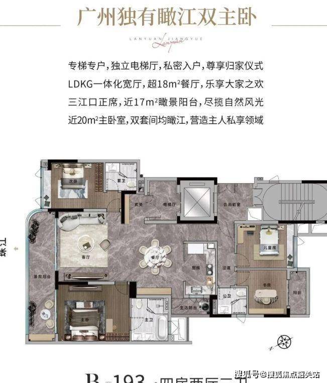 户型设计尽显奢华与舒适,仅提供 193㎡和 285㎡两种大户型,虽选择范围较窄,但却精准定位高端圈层。193㎡四房户型,LDKG 一体化宽厅设计,让空间更加开阔通透,双套间主卧均瞰江,近 17㎡观景阳台,可饱览江景,享受惬意生活。285㎡五房户型更是奢华至极,270° 环幕江景阳台,将江景尽收眼底,约 60㎡双景会客厅,彰显尊贵大气,主卧配备书房及双衣帽间,满足高品质生活需求,为业主打造专属的私密空间,尽享豪华居住体验。