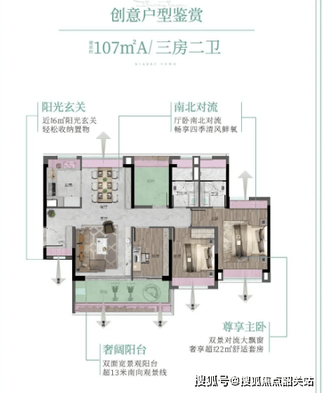 刚需上车优选,罕见四面宽小户型,三卧室朝南,超 11 米景观线,阳光充足;