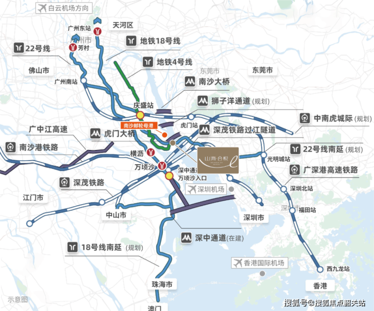 ● 地铁:距4号线、15号线(规划中)、22号线(南连莞深,时速160km,首段已开通)三地铁交汇的南沙客运港站仅900米,未来30分钟直达广州中心,2站可换乘深圳地铁;