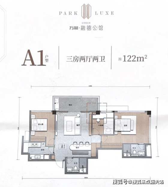 122㎡三房朝北:同样是飞机户型,主阳台超长,可以望向千灯湖,主卧拥有270度景观玻璃窗,但依然存在餐厅靠近公卫的问题。