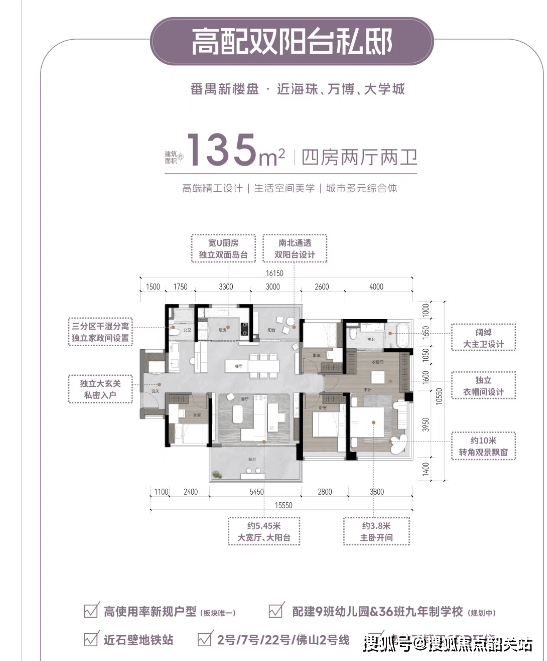 项目地处广州南站约1.4公里处,坐拥“超级枢纽”红利。周边汇聚地铁2号线、7号线、22号线及佛山2号线,其中22号线作为高速地铁,未来可快速直达珠江新城、琶洲、白鹅潭等核心板块;广佛环线东环已通车,3站抵琶洲,6站达珠江新城。此外,项目享有京广、贵广、广深港等5条高铁及多条城际线路,1小时通达大湾区主要城市。为弥补步行距离短板,社区已开通专属楼巴及公交接驳,5–8分钟可达地铁站点。自驾方面,海珠湾隧道(预计2025年底试运营)将进一步缩短至海珠、天河的通勤时间。整体交通网络立体高效,唯需依赖接驳工具,对纯地铁通勤族略有不便。