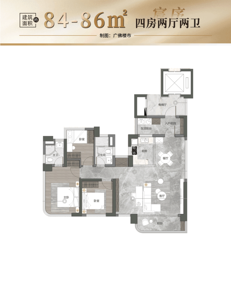 在传统户型设计中,80 多㎡通常只能做到两房或紧凑三房一卫,而中建岭南序约 84-86㎡户型,直接打造出南向四房两卫 + 独立电梯厅的阔绰格局,堪称刚需户型的 “天花板”。