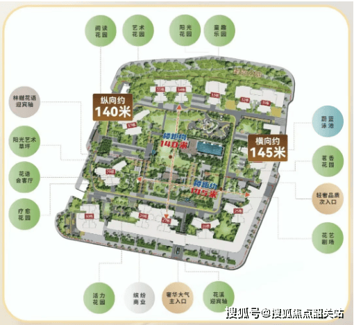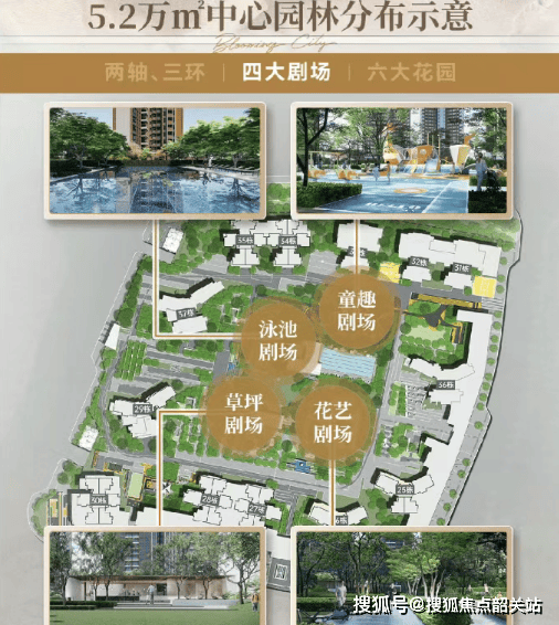 约10万㎡中央园林,含5.2万㎡央景园林、600㎡泳池、2500㎡全龄游乐场、六大主题花园;