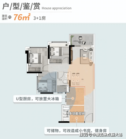 76㎡3+1房:客餐厨阳台一体化,低总价轻松上车天河;